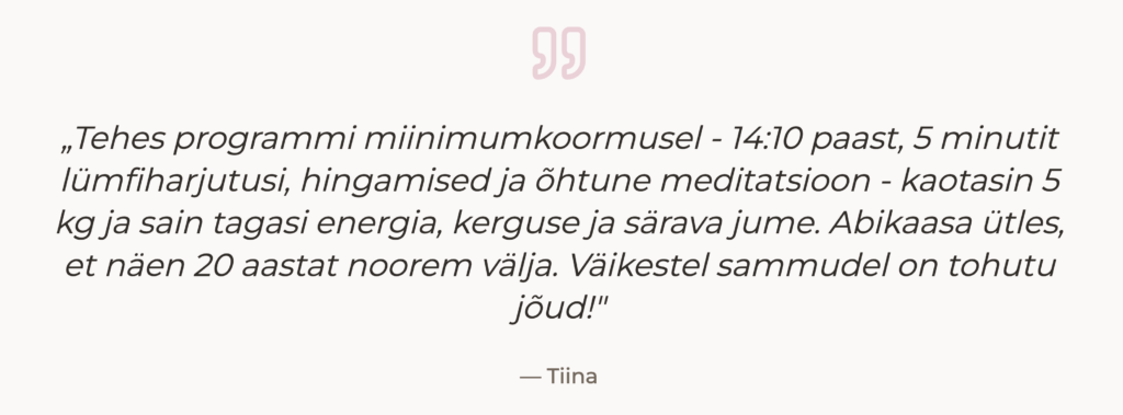 “Olen töötanud minapildi teemadega alates 2011. aastast. Aastate jooksul sain selgeks, et kuigi sisemise muutuse mudel — 12 sammu minapildi restardiks — on universaalne, tuleb igas eluvaldkonnas kasutada erinevaid taktikaid. Keha puhul sai otsustavaks teadmine, et muutus algab seestpoolt. Just siis, kui liigub lümf, rahuneb närvisüsteem, stabiliseerub veresuhkur vahelduva paastuga ja korrastuvad sisemised uskumused, hakkab muutuma ka kehapilt.