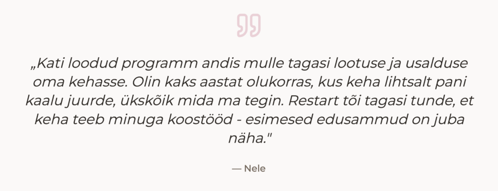 Kati töö fookuses on aidata inimestel viia elu- ja kehamuutused ellu ilma läbipõlemiseta — süsteemselt, õrnalt ja teadlikult.